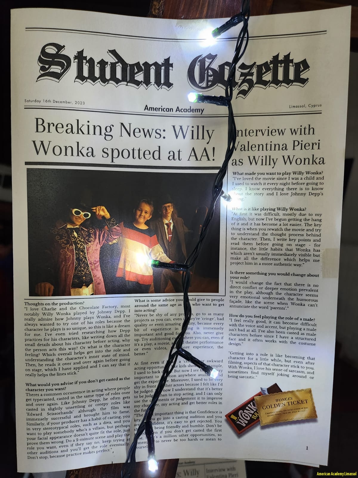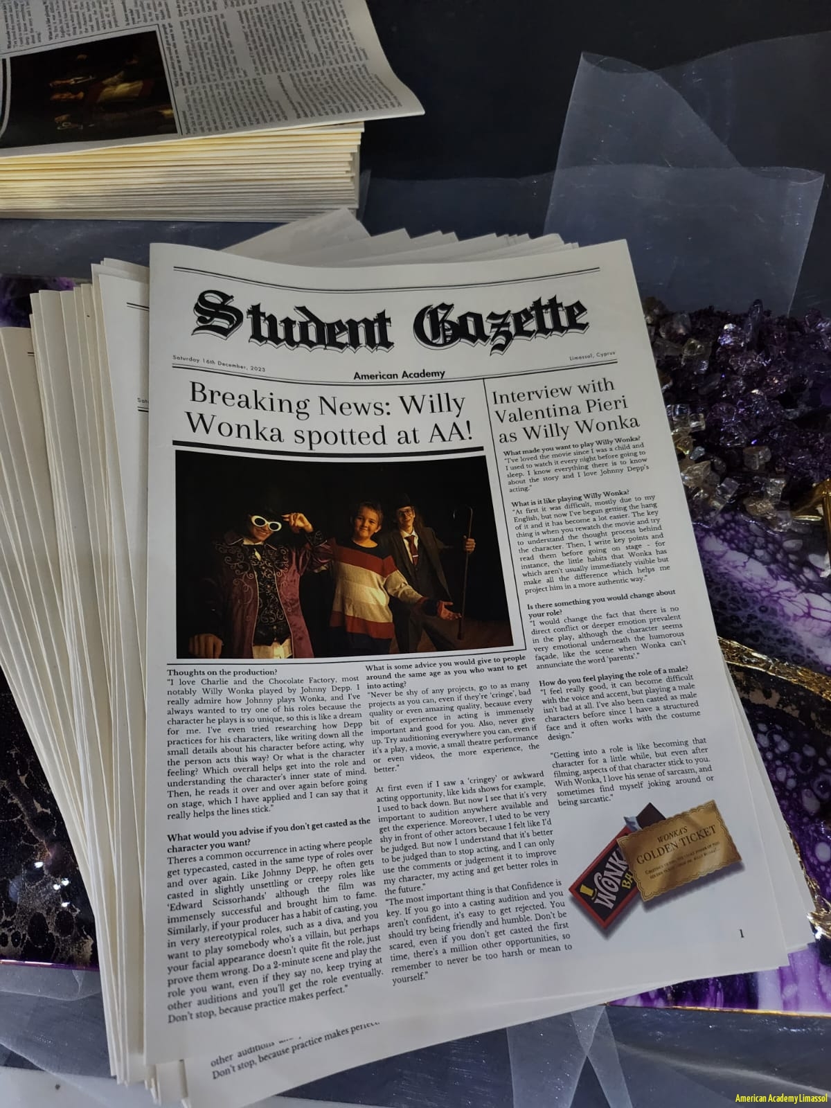 Congratulations to our talented students who performed in Charlie and the Chocolate Factory. We are so proud of you all. Thank you to all those who helped and also to our dedicated teachers for their many hours of hard work. Much appreciation to Class 7 for the compilation of the student gazette and sale of Christmas goodies